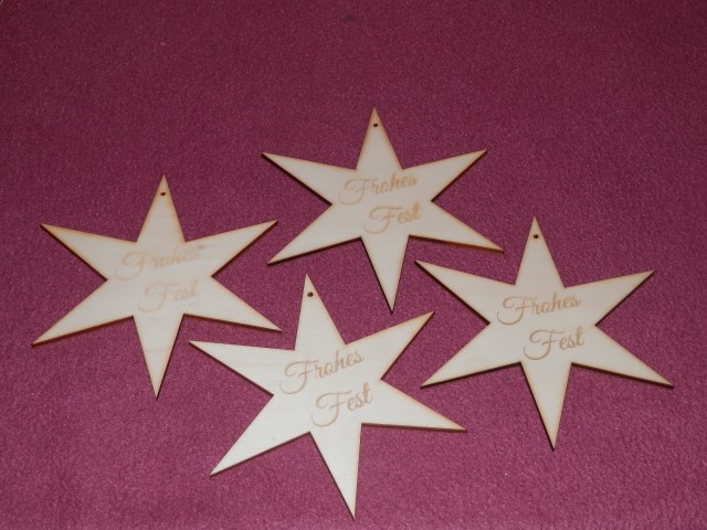 Wir bieten an ... ein Set aus vier Sternen...Länge 13cm ... graviert mit der Aufschrift "Frohes Fest"